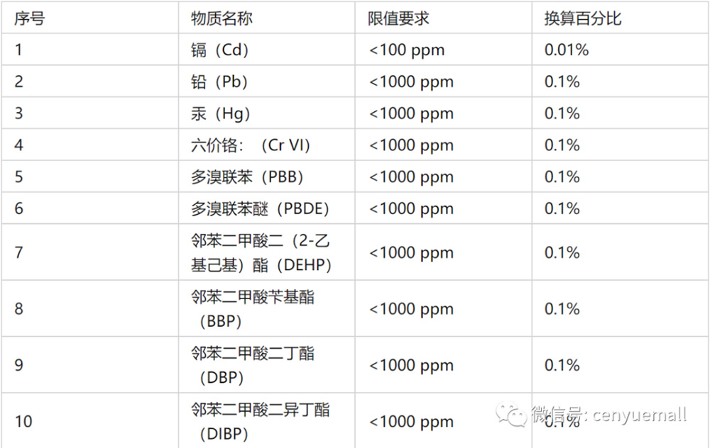 其中VOCs和放射性物質(zhì)氡的檢測報告可以參考《GB50235-2020》,對涂料、膠黏劑、瓷磚、人造木制品板材、木塑材料以及帶自粘性質(zhì)的墻紙、塑料膜類、軟質(zhì)地板等都做出了VOC和氡的限量要求。重金屬和鹵素可以參照ROHS2.0,關(guān)于限值如下表所示